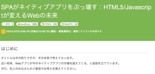 ネタとしてはちょっと古い感じがしますがSingle-page Application(SPA)の記事です。 SPAがネイティブアプリをぶっ壊す:HTML5/Javascriptが変えるWebの未来 - Qiitaqiita.com 立派に釣ってるのでお見事というしかありませんが、自分の名前が最初にでているの…